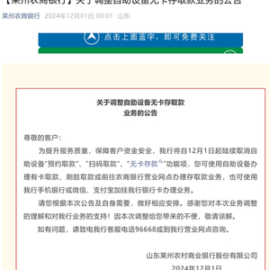 蓝鲸新闻12月4日讯(记者 金磊 肖阳 实习生)近日,山东莱州农村商业银行(下称“莱州农商行”)发布关于调整自助设备无卡存取款业务的公告。