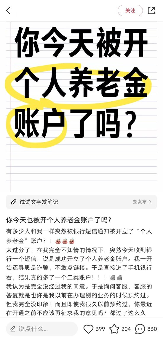 还有一位客户表示,12月15日被银行短信告知开通个人养老金账户,短信内容称为自己预约开通,但客户坚称并未预约。在某社交平台上,一位客户甚至发长文投诉“被”开通的情况。