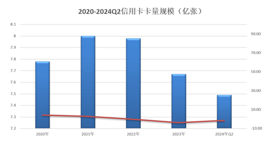 2024年的信用卡市场步入寒冬,整体卡量规模从2022年Q3的8.07亿张到2024年Q2的7.49亿张,连续七个季度下跌,总计减少了5800万张。各发卡银行信用卡业务增长势头被遏制,多项业务指标出现不同程度下降。