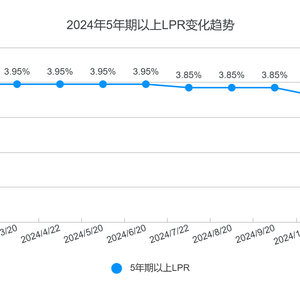 其中5年期以上LPR对房贷利率影响最大,2024年内共出现过3次下调。具体来看,2024年2月,5年期以上LPR由4.2%下降至3.95%;7月,再次下调10基点,降至3.85%;10月再次下降25BP至3.6%,至12月仍维持3.6%的水平。以此计算,5年期以上LPR由年初的4.2%降至年末的3.6%,累积下调60个基点。