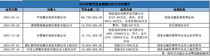 不过,虽然罚单数量、被罚金额均出现下滑,但2024年内仍有5家银行被罚金额达到1000万以上。其中,平安银行2024年5月被国家金融监督管理总局罚没6073.98万元。罚单显示,平安银行因在公司治理与内部控制、信贷业务、同业业务、理财业务等领域存在违规问题,需上缴违法所得,并支付罚款。总行被罚款6073.98万元,分支机构被罚款650万元。此外,深圳前海微众银行、齐鲁银行、浙江稠州商业银行上海分行、工商银行上海分行被罚金额也在1000万元以上。