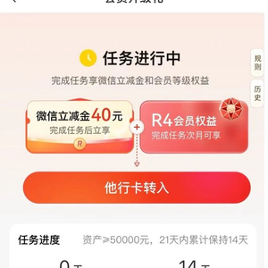 中国银行也还推出了类似的“等级晋升礼”。活动规则显示,报名客户上月日均金融资产小于20万元,报名活动当月晋级为理财客户,即月日均金融资产达到20万-100万元(不含),即可获赠100元的微信立减金权益,活动金额最高可达300元。