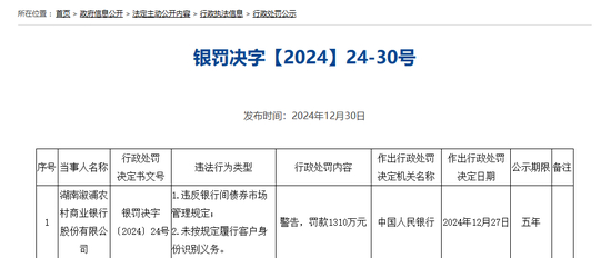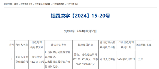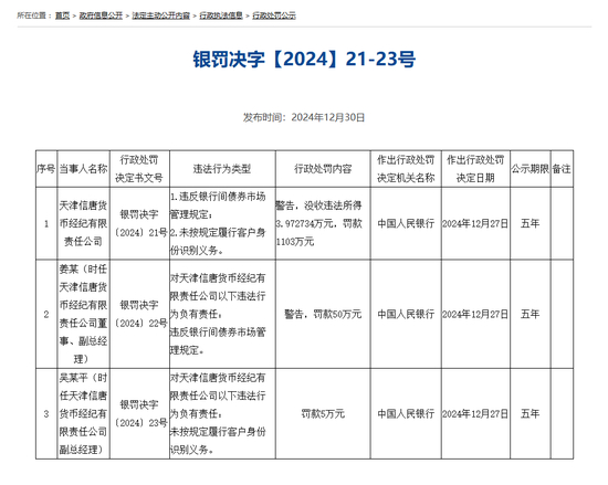 12月30日,中国人民银行在官网公示了一批行政处罚。上海东亚期货有限公司、天津信唐货币经纪有限责任公司、湖南溆浦农村商业银行股份有限公司及相关责任人受罚。