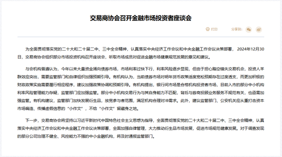 同时,2024年12月30日,交易商协会组织部分市场投资机构召开座谈会,听取市场成员对促进金融市场健康规范发展的意见和建议。