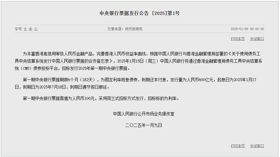 2025年1月9日,中国人民银行发布公告称,1月15日将通过香港金融管理局债务工具中央结算系统(CMU)债券投标平台,招标发行2025年第一期中央银行票据(简称“央行票据”)。