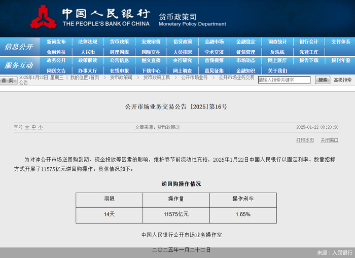 临近春节,人民银行万亿元逆回购操作引发关注。1月22日,人民银行发布消息称,为对冲公开市场逆回购到期、现金投放等因素的影响,维护春节前流动性充裕,人民银行以固定利率、数量招标方式开展了11575亿元逆回购操作,期限14天,利率1.65%,与此前持平。因当日有9595亿元7天期逆回购到期,此次人民银行操作后,实现净投放1980亿元。