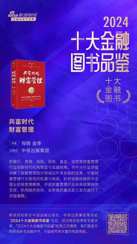 1月23日金融一线消息,经过两个多月的激烈角逐和专家评审,新浪财经联合中国金融出版社、中信出版集团等发起的“2024十大金融图书品鉴”活动结果正式揭晓。肖钢、金李所著《共富时代财富管理》获评2024十大金融图书。