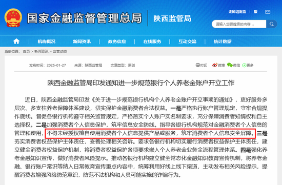 陕西金融监管局明确指出,(银行机构)应严格执行账户管理规定,守牢合规操作底线。督促各银行机构遵守相关监管规定,严格落实个人账户实名制要求,充分保障消费者知情权和自主选择权。同时,加强消费者个人信息保护,筑牢信息安全防线。指导各银行机构规范对金融消费者个人信息的管理和使用,不得未经授权擅自使用消费者个人信息提供产品或服务,筑牢消费者个人信息安全屏障。