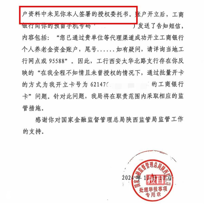 近日,陕西网友郝予安向极目新闻反映,工行西安太华北路支行和社区居委会签订《批量开立个人养老金账户协议书》(以下简称《协议书》)后,在其全程不知情、未授权的情况下开通了个人养老金账户。国家金融监督管理总局陕西监管局回函指出,开户资料中未见郝予安本人签署的授权委托书,成为案件的重要证据。