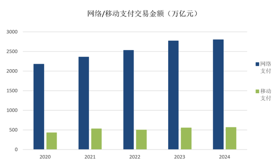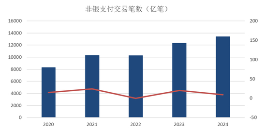 *(原文)非银行支付机构处理网络支付业务量包含支付机构发起的涉及银行账户的网络支付业务量,以及支付账户的网络支付业务量。自 2023 年起,人民银行修订后的《非银行支付机构支付业务数据统计口径(试行)》正式实施,将转账业务统一纳入统计,并对支付机构间合作业务去重。
