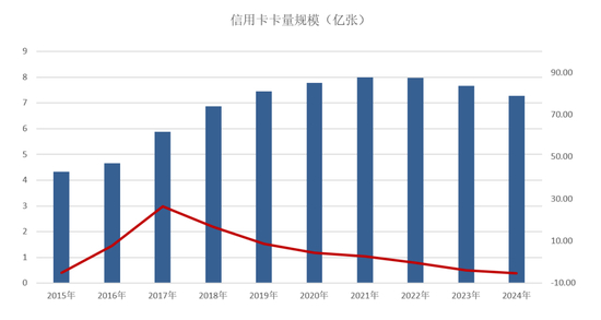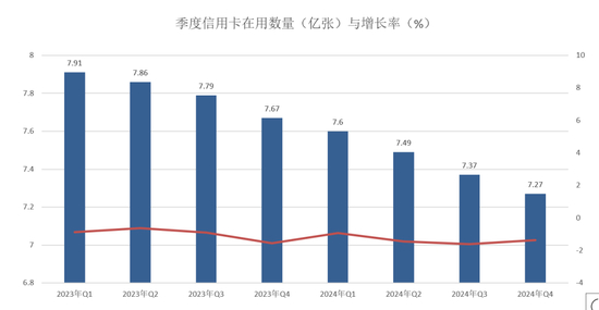 央行发布了《2024年支付体系运行总体情况》,2024年末信用卡和借贷合一卡在用发卡数量为7.27亿张,比2023年末下降5.14%,共计减少4000万张,同时,季度环比下降1.35%,与2022年第四季度8.07亿张相比,连续九个季度持续下降,减少8000万张,规模已经低于2019年末。
