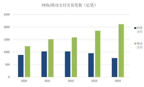 网上支付业务754.35亿笔,同比下降20.5%,金额2798.32万亿元,同比增长1.19%;移动支付业务2109.8亿笔,金额563.7万亿元,同比分别增长13.95%和1.5%。