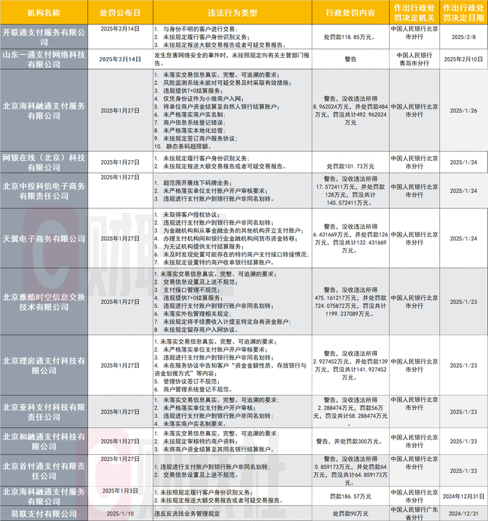 财联社2月19日讯(记者 高萍)新《反洗钱法》实施以来,金融业相关违规被罚案例就备受关注。财联社记者不完全统计发现,2025开年来有12家支付机构被罚,其中,反洗钱违规案由亦多次出现。