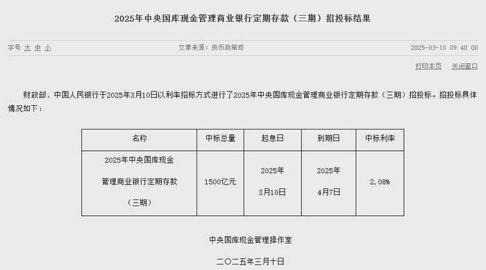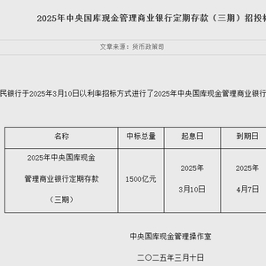 3月10日金融一线消息,财政部、中国人民银行于2025年3月10日以利率招标方式进行了2025年中央国库现金管理商业银行定期存款(三期)招投标,中标总量1500亿元,起息日为2025年3月10日,到期日为2025年4月7日,中标利率2.08%。