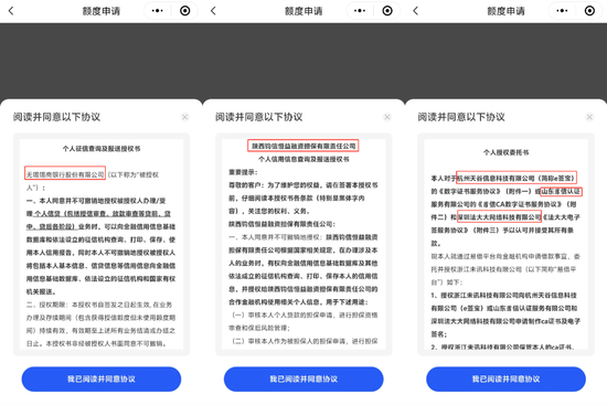 贝多财经在易借速贷进行用户注册后发现,在额度申请阶段,易借速贷便要求用户上传身份证件。在随即跳转的个人征信及报送授权书中,申请人还需同意包括无锡锡商银行股份有限公司(下称“锡商银行”)在内五家公司的授权协议。