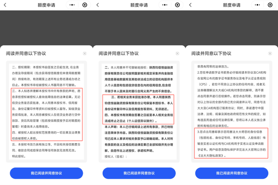 协议明确提出,用户需要承担授权协议方查询信用信息的法律后果。且无论最终信贷业务是否获批,用户都需不可撤销地将授权书、身份证件复印件、信用报告等资料交由授权协议方留存,后者无须退还。