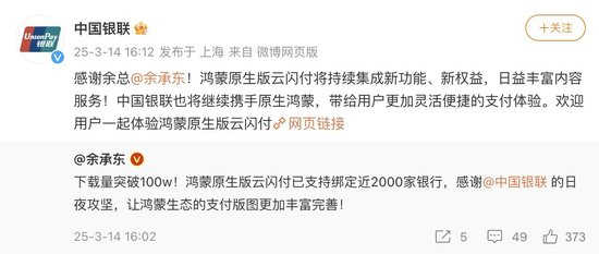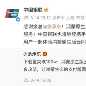 3月14日,华为常务董事、终端BG董事长、智能汽车解决方案BU董事长余承东在微博发文祝贺鸿蒙原生版云闪付下载量破百万,据余承东介绍,鸿蒙原生版云闪付已支持绑定近2000家银行,跨行管理账户更方便。余承东还感谢了中国银联的日夜攻坚,让鸿蒙生态的支付版图更加丰富完善。随后中国银联迅速回应,表示将继续携手鸿蒙,带来更加灵活、便捷的支付体验。鸿蒙原生版云闪付作为中国银联推出的银行业统一移动支付战略产品,凭借更便捷的智感支付、更周全的隐私保护,再次走在了移动支付行业的创新前沿。