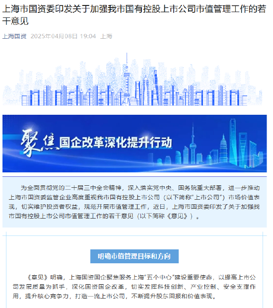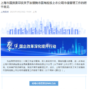 上海市国资委印发加强国有控股上市公司市值管理工作的若干意见