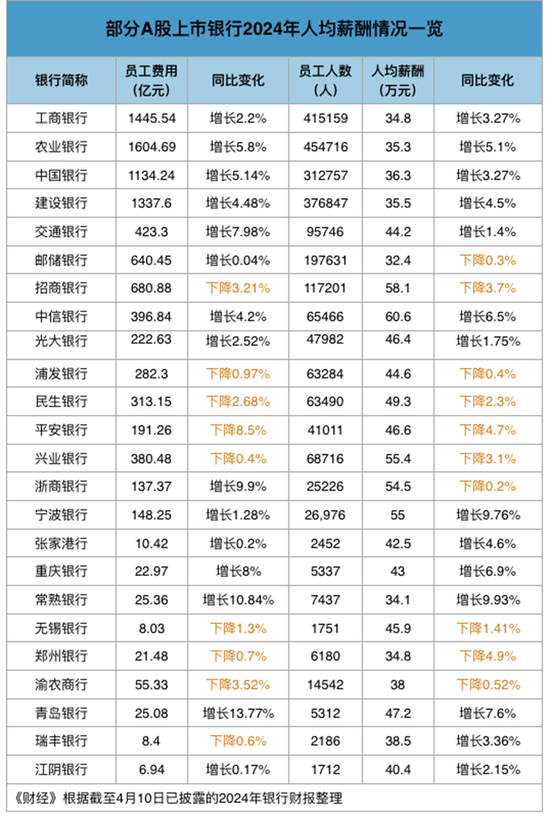 虽然中小银行人均薪酬领跑,不过以同比增速看,半数中小银行2024年降薪,五大行涨薪。
