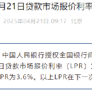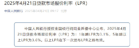 4月21日金融一线消息, 中国人民银行授权全国银行间同业拆借中心公布,2025年4月21日贷款市场报价利率(LPR)为:1年期LPR为3.1%,5年期以上LPR为3.6%。以上LPR在下一次发布LPR之前有效。