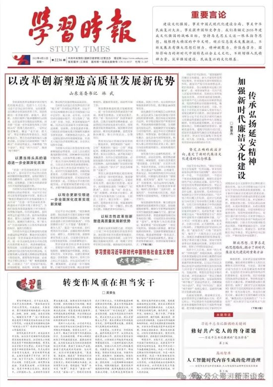 4月21日,山东省委书记林武在《学习时报》上发表署名文章“以改革创新塑造高质量发展新优势”,其中提到了“地方农商行、村镇银行和城商行的机构改革工作”。