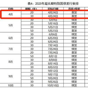 根据前期公布的发行安排,2025年中央金融机构注资特别国债共4只,其中2只为5年期、2只为7年期。据财政部此前介绍,2025年,财政部将发行首批特别国债5000亿元,积极支持中国银行、中国建设银行、交通银行、中国邮政储蓄银行补充核心一级资本。此次资本补充工作将按照市场化、法治化原则稳妥推进。