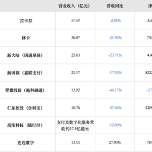 4月29日,据北京商报记者不完全统计,已有拉卡拉、移卡、国通星驿、嘉联支付、海科融通、合利宝、随行付、连连数字等8家支付机构2024年经营情况披露。其中拉卡拉、移卡分别为A股、港股上市支付公司,连连数字则在2024年3月成为港股新成员,剩余几家机构属于上市公司旗下业务板块。
