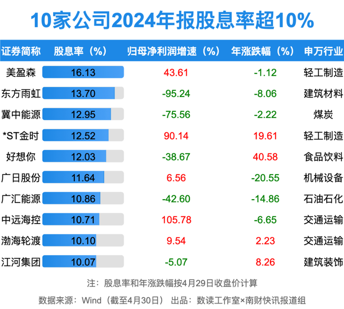 从股息率来看,以4月29日收盘价计算,612家公司2024年报股息率超3%。其中,股息率超6%的公司达73家,美盈森、东方雨虹、冀中能源等10家公司股息率超10%。