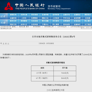 4月30日金融一线消息,央行今日发布公开市场买断式逆回购业务公告,为保持银行体系流动性充裕,2025年4月中国人民银行以固定数量、利率招标、多重价位中标方式开展了12000亿元买断式逆回购操作。其中,3个月期限的操作量为7000亿元,6个月期限的操作量为5000亿元。