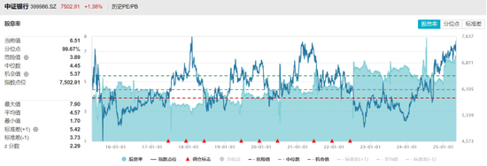 由于银行股近期持续走高,其板块估值也不断抬升,截至今日(5月9日)收盘,中证银行指数目前市盈率6.62倍,位于近十年75.01%分位点;市净率0.67倍,处于近十年36.23%分位点。此外,其目前股息率升至6.51%且处于近十年99.67%分位点,较去年年末时(4.83%)提升近1.7个百分点,但距离2024年7月中旬录得的历史最高点(7.9%)仍有一定距离。