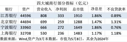 截至今年一季度末,四家银行总资产规模由高到低分别为北京银行(4.47万亿)、江苏银行(4.46万亿)、宁波银行(3.4万亿)、上海银行(3.3万亿)。