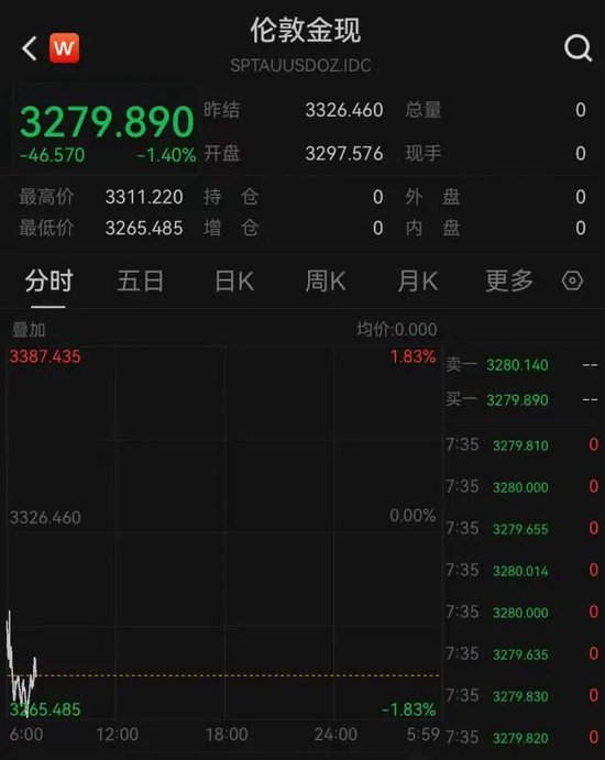 5月12日,伦敦金现开盘即现颓势,低开幅度超1%,随后跌幅进一步扩大至1.8%,价格一度跌破每盎司3270美元。截至记者发稿时,伦敦金现报每盎司3279美元,延续震荡行情。