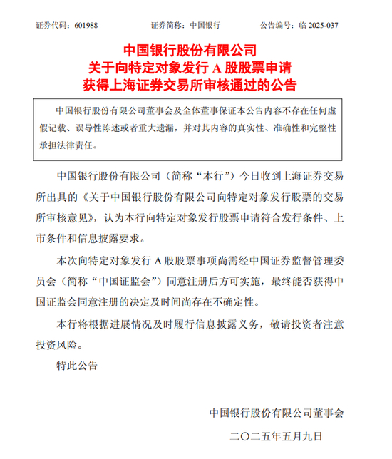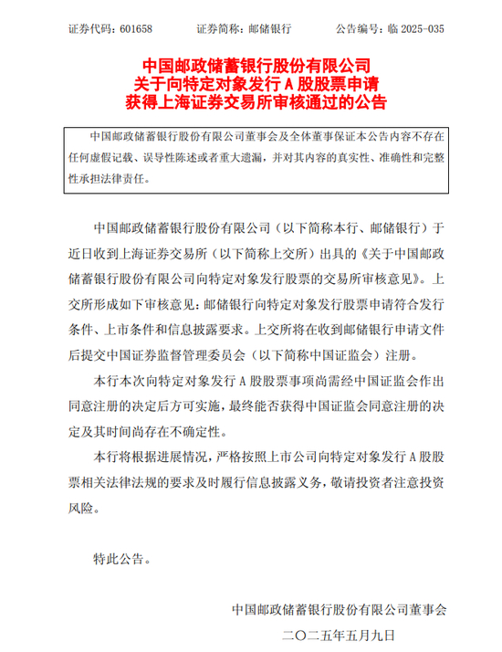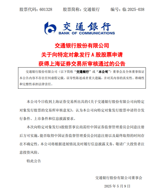 5月9日,中国银行、交通银行、邮储银行发布公告称,三家银行向特定对象发行A股股票的申请均已经获得上海证券交易所审核通过。