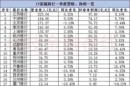 在17家城商行中,虽然整体增速可观,但也有个别银行下滑严重。具体而言,一季度,17家A股上市城商行中,有14家营收实现正增长,3家出现负增长,其中,更是有贵阳银行、厦门银行出现高达15%以上的负增长。而在净利方面,也同样有3家出现负增长,其中厦门银行同样处于垫底位置,下滑幅度高达14.21%。