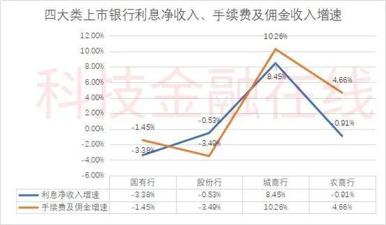 一季度数据显示,42家上市银行的利息净收入增速存在明显分化,其中6家国有大行下降幅度最大,整体较去年同期下降3.38%;而在手续费及佣金净收入方面,则是9家股份行整体下滑最为严重,较去年同期下降3.49%。作为对比,城商行及农商行两大指标基本都实现了大幅增长,比如17家城商行两大指标整体分别增长8.45%、10.26%,而10家农商行手续费及佣金收入则增长了4.66%。
