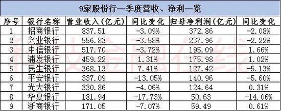 而9家股份行也同样是相似的态势,且从数据绝对值来看,内部分化幅度更大。其中,在营收增速方面,民生银行录得了最高的7.41%的高增长,而华夏银行的下滑幅度则最高,达到17.73%。值得关注的是,华夏银行是9家银行中唯一一家营收、净利均录得双位数负增长的股份行。