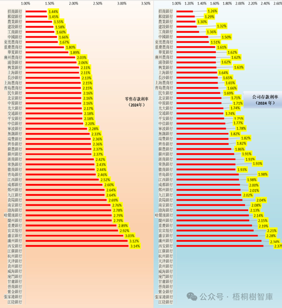 仅47家上市银行披露了零售与公司存款利率。数据上看,2024年零售存款利率的最小值为1.44%(招商银行)、最大值为3.14%(西安银行),平均数与中位数分别为2.29%与2.28%;2024年公司存款利率的最小值为1.26%(青岛农商行)、最大值为2.37%(哈尔滨银行),平均数与中位数分别为1.81%与1.78%。