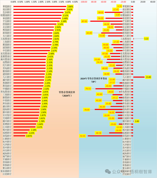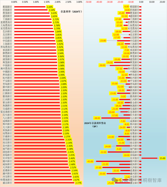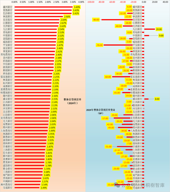 仅50家银行公布了零售贷款利率与存款利率数据。50家上市银行的零售贷款利率最大值为6.8%(常熟银行)、最小值为3.54%(贵阳银行),平均数与中位数分别为4.71%和4.63%。其中,2024年除常熟银行上升7BP外,其余49家银行的零售贷款利率均出现下降,幅度平均达到55BP(较整体贷款利率下降幅度高出15BP),贵阳银行、中原银行、渤海银行、盛京银行、光大银行、西安银行与平安银行的收窄幅度最大。
