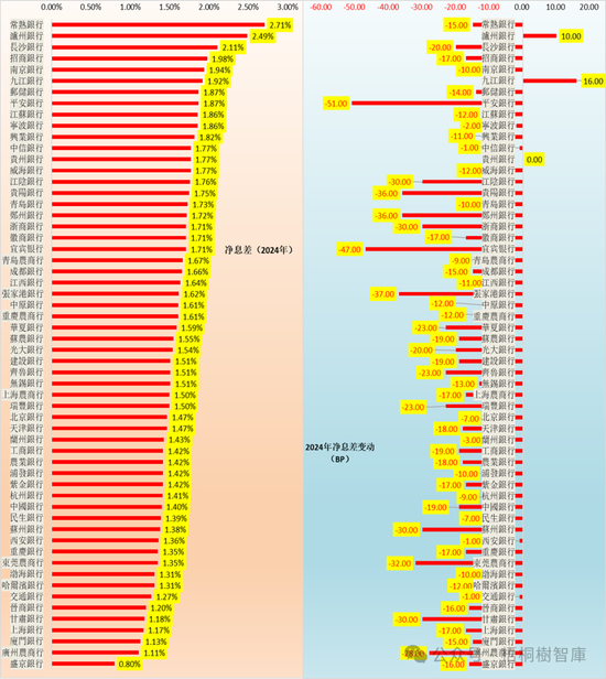 1、58家上市银行的净利差最大值为2.71%(泸州银行)、最小值为1.02%(盛京银行与甘肃银行),平均数和中位数分别为1.51%和1.48%。其中,除泸州银行、九江银行外,其余56家银行的净利差均明显收窄,幅度平均为16-17BP。