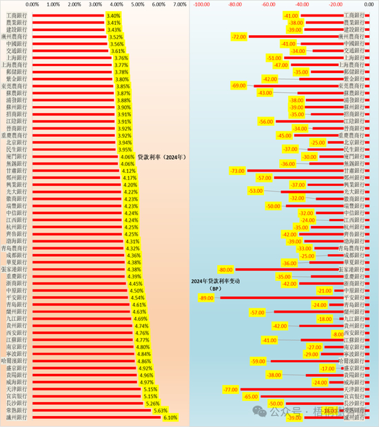 1、58家上市银行的贷款利率最大值为6.1%(泸州银行)、最小值为3.4%(工商银行),平均数与中位数分别为4.31%和4.24%。其中,2024年58家银行贷款利率均出现收窄,幅度平均在40BP左右,部分银行收窄幅度较大(如平安银行、广州农商行与东莞农商行、张家港银行、天津银行等)。