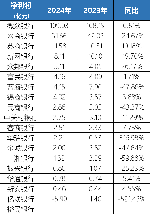 具体到净利润,“头部稳、腰部缓、尾部亏” 的特征更为鲜明。微众银行(109.03 亿元)与网商银行(31.66 亿元)合计占比近75%,其中微众银行净利润同比微增0.81%,展现抗周期能力;网商银行因拨备计提加大,净利润同比下滑 24.67%,但仍稳居第二。尾部亿联银行成为行业唯一亏损机构,2024年巨亏5.9亿元,同比降幅达 521.43%,主要因合作贷款踩雷导致信用减值损失激增;除此之外三湘银行、金城银行、蓝海银行、民商银行等净利润降幅超40%,盈利压力凸显。