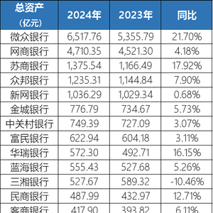 其中,新网银行以0.68%的微弱增速勉强守住千亿门槛,较2023年21.36%的增速大幅回落,增长动能式微;苏商银行、众邦银行则以17.92%、7.9%的增速稳健扩容,展现区域头部银行的韧性。