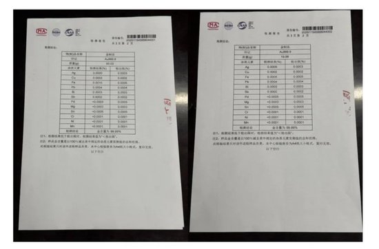 “经检测,两款金条检测报告均记载‘检测结论:金含量为99.99%’,无质量问题。经上述质检机构以专业方式清洗,疑似杂质已脱落,应为金条售出后的外部附着物。以上结论均获客户认可。”工行上海嘉定支行表示。