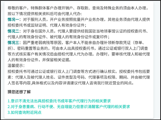对于这种问题,2018年有用户甚至向中国政府网的总理信箱留言,当时银监会是明确表明过态度的,就是本人无法到场的情况下,银行可以采取上门服务方式办理,或者被委托人拿着委托书和关系证明文件也能办理。