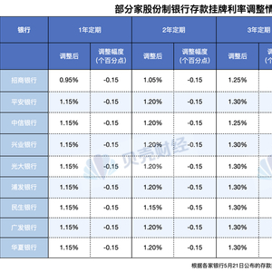 上述8家股份制银行将1年、2年定期利率均调降了15个基点。其中,1年定期存款利率均下调至1.15%;2年定期存款利率普遍下调至1.20%,民生银行下调至1.15%。3年、5年定期存款利率均下调了25个基点,分别下调至1.30%、1.35%。