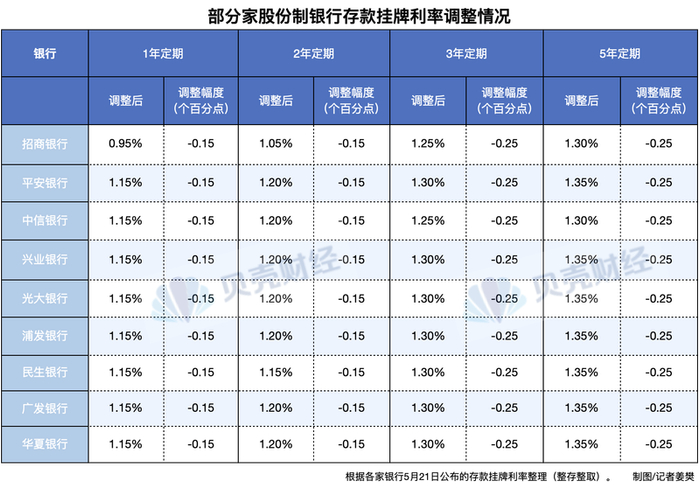 新京报贝壳财经讯(记者姜樊)5月21日,贝壳财经记者统计,已有9家股份制银行跟进下调了存款挂牌利率。除了招商银行已于5月20日下调之外,平安银行、中信银行、兴业银行、光大银行、浦发银行、民生银行、广发银行、华夏银行共8家股份制银行均已于5月21日开始执行新的存款挂牌利率。