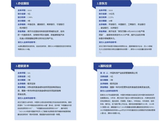 5月12日,北京地区首个股权投资机构科技创新债券正式发行,发行人为经开区国有企业亦庄国投,债券规模5亿元、期限5年,募集资金全部用于科技创新领域出资。5月13日,另一家科技型企业科技创新债券正式发行,发行人为京东方集团,规模10亿元、期限10年,募集资金用于对科技制造项目的出资及补充流动资金。此外,民营创投机构代表君联资本已进入注册通道,创投机构国科投资已申报发行,募集资金将精准用于信息技术、智能制造等科技创新领域的基金出资和股权投资,为该领域的科技型企业提供资金支持。