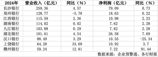 在营收方面,2024年,长沙银行以营业收入259.36亿元,位列第一;郑州银行和江西银行分别以128.77亿元和115.59亿元的营业收入位列第二和第三;湖南银行、九江银行和湖北银行2024年也实现了超百亿元的营业收入。相比之下,上饶银行和赣州银行2024年营业收入体量较小,均不足百亿元,和头部的长沙银行存在大约4倍的差距。