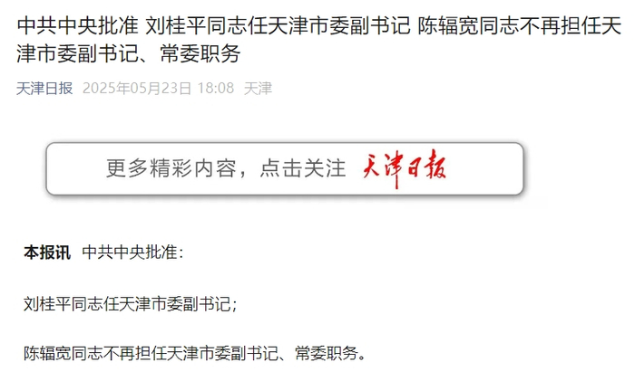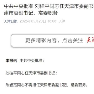 5月23日金融一线消息,据天津日报,中共中央批准:刘桂平同志任天津市委副书记,陈辐宽同志不再担任天津市委副书记、常委职务。