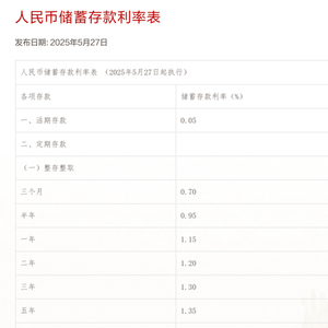 自5月26日起,江苏银行也调整了人民币存款挂牌利率。调整后,该行一年期、二年期、三年期、五年期整存整取定存利率分别降至1.05%、1.25%、1.45%、1.45%。